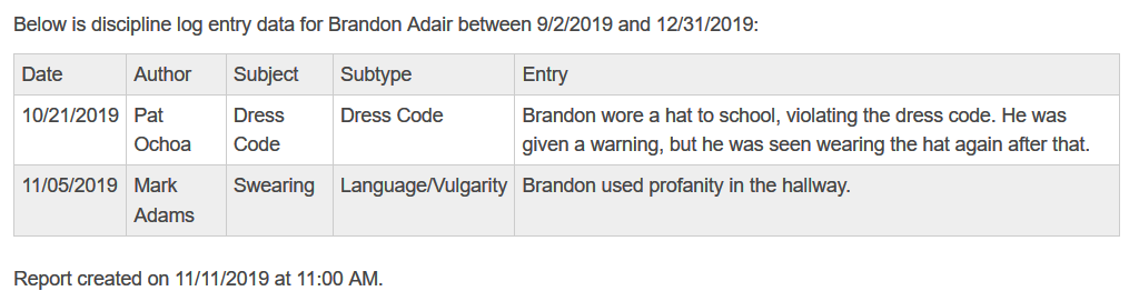 | Discipline Log Entries - log entries for a student based on the date range entered by the user. (screenshot) | 12/27/2019 |