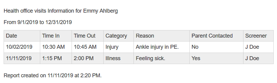 | Health Office Visits - health office visits for a student based on the date range entered by the user. (screenshot) | 12/27/2019 |