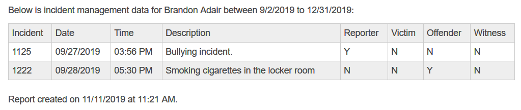 | Incident Management Information - incidents for a student based on the date range entered by the user. (screenshot) | 12/27/2019 |