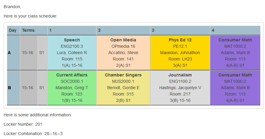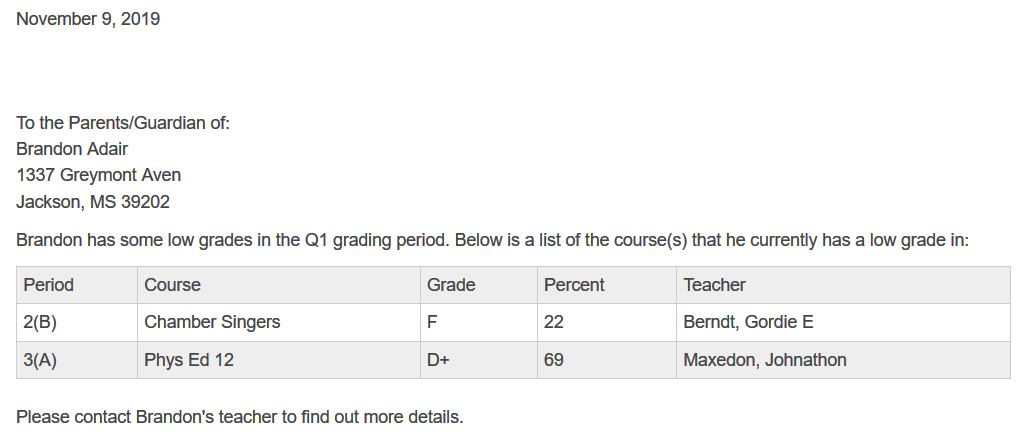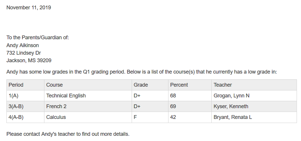 The screenshots below are based on fictional data. They are in color, but your letters will probably print in black and white. When testing out the letters, run them for just a small selection of students or staff. Use the print preview feature of your browser to view the output before sending the output to a printer. Letters can look different in different browsers, so be sure to view them in the browser you or other admins will be using when printing the letter.