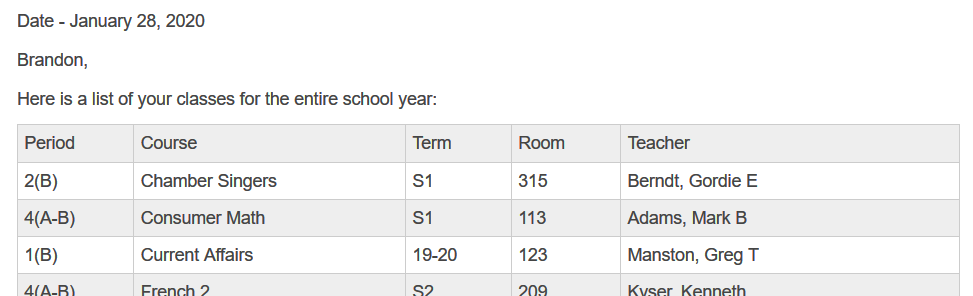 | Student Schedule Matrix - an example of a custom letter. The output is similar to the student schedule matrix group function, but with additional information. (screenshot) | 1/28/2020 |